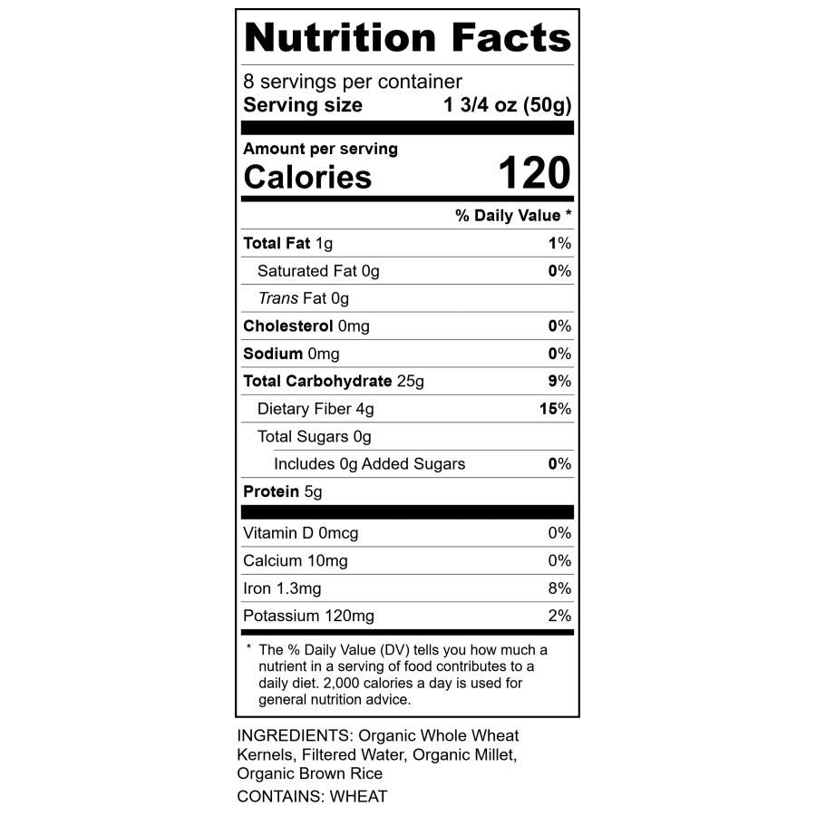 Sprouted organic wheat kernels, filtered water, organic millet, organic brown rice.
